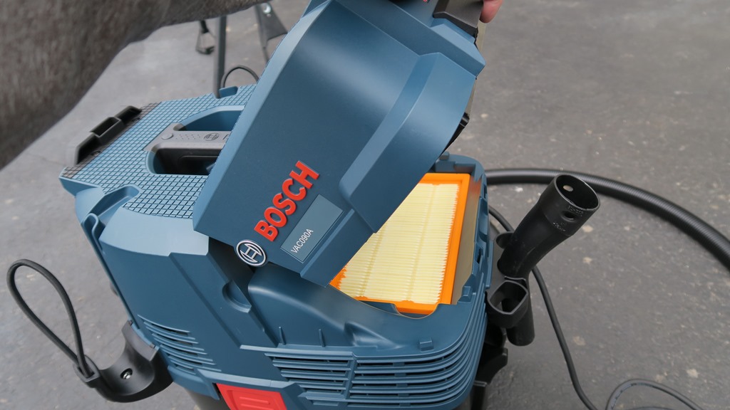 While some of us just look at this product as a dust extraction system which should be plain and simple, Bosch definitely did not. Bosch set out to create one of the most powerful extraction systems. In fact, it is the best in class combination of air flow and suction power. The Bosch VAC090A doesn’t just perform dry pick up, but it can also be used for wet pick up. However I was a little disappointed that it doesn’t come with the HEPA filter. The unit comes with a VF100 which is designed for dry pick up only. Yes, you can use it for small wet pick up, but in order for this vacuum to really shine, you need the HEPA filter VF120H. If you decide to perform wet pick up, the system will sense the water level and automatically shut off at a certain level. One feature I love about this unit is the 15 second interval cleaning cycle. Every 15 seconds the filter does a blow back where it cleans the filter from debris and helps keep the suction at top peak.