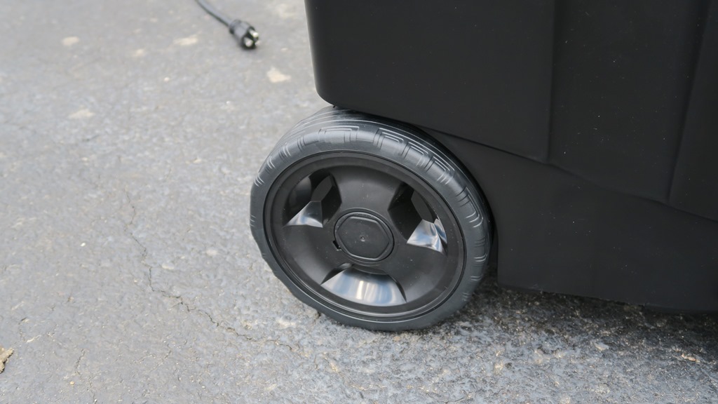 On the front of the unit, you will see four important aspects of this vacuum.  The top most dial is to select whether you want to just run it as a constant on vacuum or an automatic extractor.  If you decide to do automatic, you can plug your tool right into this extractor which is located just below this dial.  When you turn your tool on, such as a table saw, the extractor will automatically turn on.  Just to the right of the dial, you can select your suction power.  Here is what’s cool about this unit.  Bosch designed this with a push button selector to turn on or off the automatic filter cleaning (AFC) system.  When the unit cleans itself, it can be rather loud, just like all the other extractors we have seen.  If you are an L-Boxx fan, you will be happy to know you can attach your L-Boxx right on top of the unit.  As far as the wheel assembly, the back wheels are big and the wheels not only rotate, but will also lock.