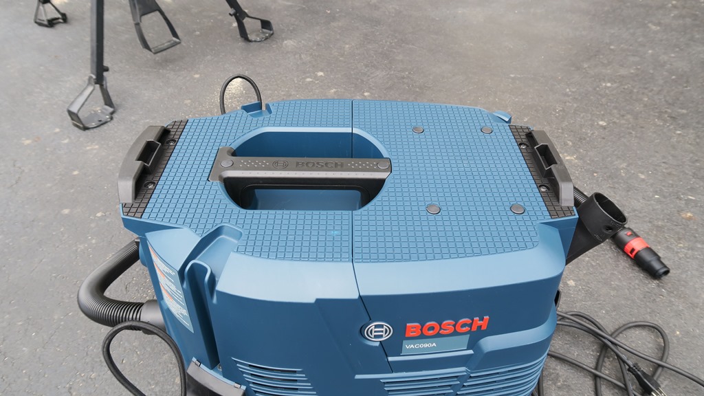 Bosch VAC090AYou can have the best dust extractor, but if it’s a pain to use or doesn’t provide enough power, what’s the use?  No worries here with the Bosch VAC090A.  First the power is great.  Is it the world’s most powerful extractor,   It’s one of the best in its class.  However this takes it one step further.  The front of the system is easy to use and has a nice layout.  Turning the power up or down is straight forward.  The biggest item is having control over the Automatic filter cleaning.  Sometimes you really don’t need this option, so it’s great to be able to turn it on/off.  That way you don’t have to listen to it cleaning itself.  As far as the wheels, they are also great.  The back wheels are big enough to help keep it stable and prevent it from tipping over.  The front locking casters spin nice and do a great job.  As far as hose management, this is the one of the best we have seen.  The Festool also has a great hose management system.  With the Bosch, you can wrap the cord up and lock the hose in place.  This way when you are moving it around, you don’t have to worry about getting the cord or hose tangled up in something.  Once you put it in place, the cord and hose will stay there.