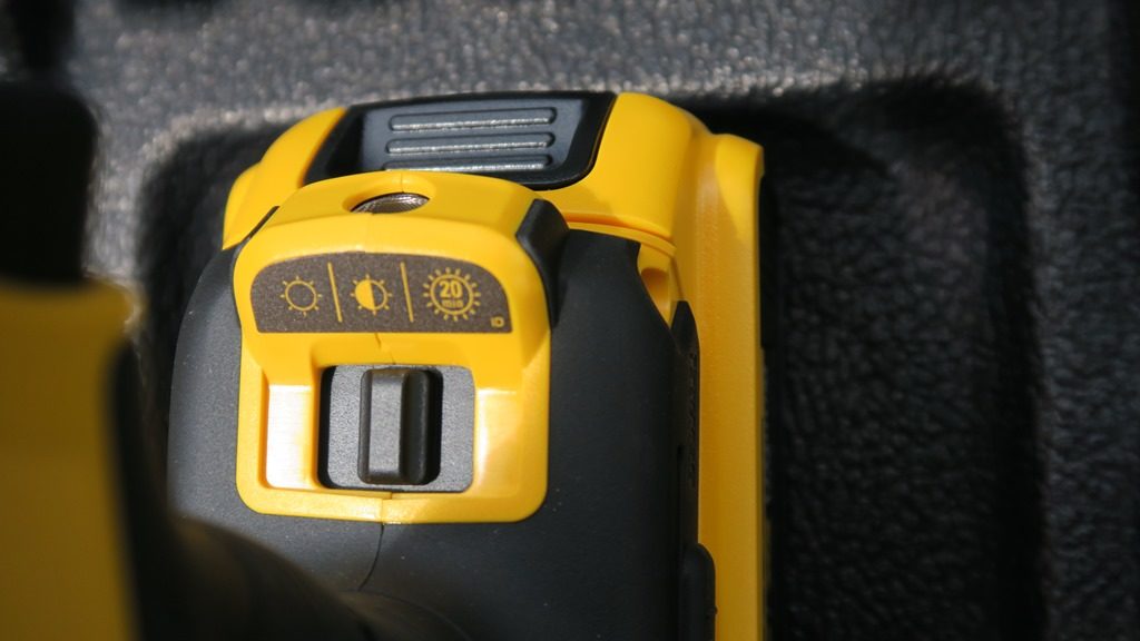 The drill has 11 torque settings plus a drill mode which is very easy to control and move to the desired location using the front metal ring. One cool feature that I haven’t seen on a lot of drills is the switch located on the front of the drill. This switch is used to control the bright LED light on the front of the drill. There are three positions including a 20 minute time. As with the other Dewalt chucks, we have seen, this one also features a ratcheting metal chuck to help keep bits securely in place.