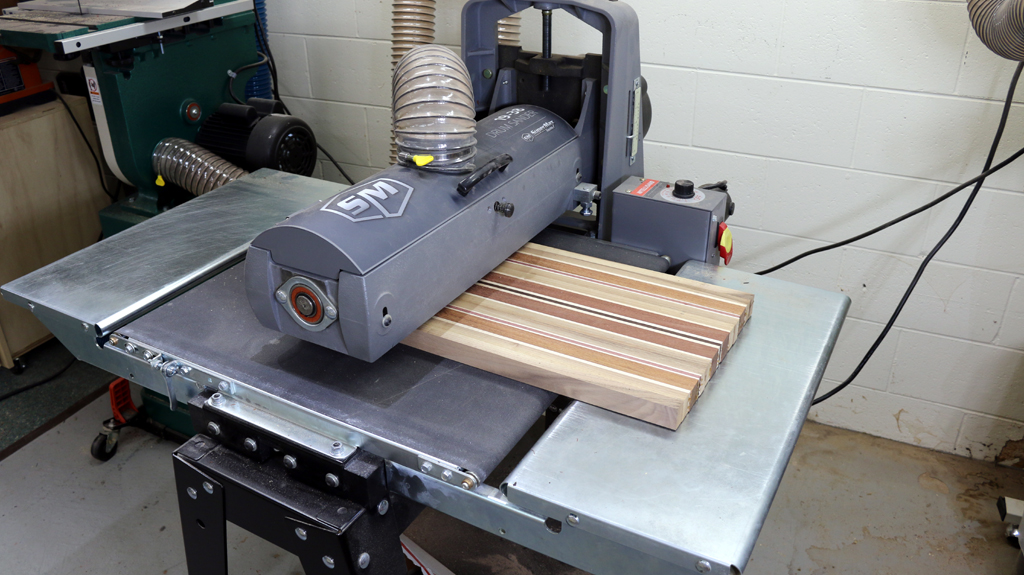 After you glue has dried, this is the worst your project is going to look.  I like to run my boards through the thickness planer to remove all of the glue on the surface of the board and to flatten it out.  Of course, my next step from here is to the drum sander, where I use 150 grit paper.  Just as before, if you don’t have a drum sander you can do this task with a belt sander or a random orbit sander.