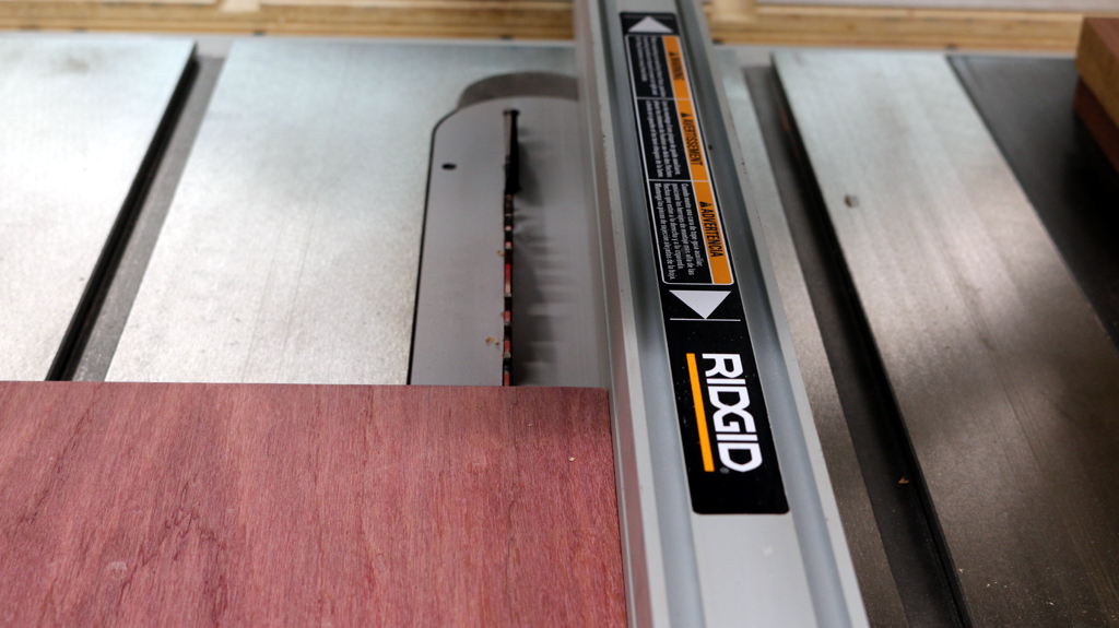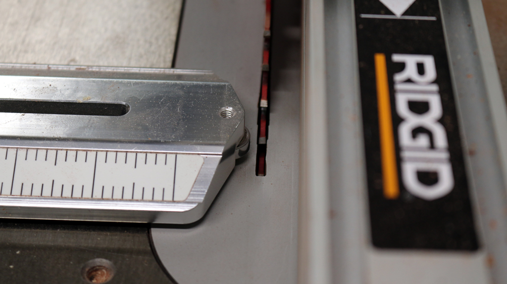 Now in order to create some really interesting thin strips on my boards, I like to take the 1-1/4″ strips of wood, stand them up on the table saw and cut really thin strip.  Since I have my blade up over 1-1/4″ in height and I want to make sure I have consistent uniform cuts, I am using a thin rip table saw jig.  After each cut, I just move the fence until the piece of wood hits the bearing on the jig.  To my knowledge, this is the safest way to cut thin strips on a table saw.