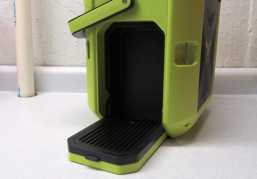 The OXX CoffeeBoxx claims to be the toughest coffee maker around and when you pick it up for the first time, you can see why. The unit weighs 12 lbs empty and that is primarily because it’s built to take a beating that happens on job sites. As you can see, the whole unit is made from a tough impact resistant polymer shell with a crush proof chassis up to 1,500 lbs. Just by that alone, I would agree is this is the toughest coffee maker around. The whole unit is water and dust resistant. Don’t want the coffee maker moving around? Well they have you covered. The Oxx is designed with 6 stainless steel tie downs. There is a large foldable handle so you can carry it your desired location, you can fold it down, so it’s not in your way. One of the coolest features of this coffee maker is the 3′ retractable power cord. Just pull the cord out and plug it in.