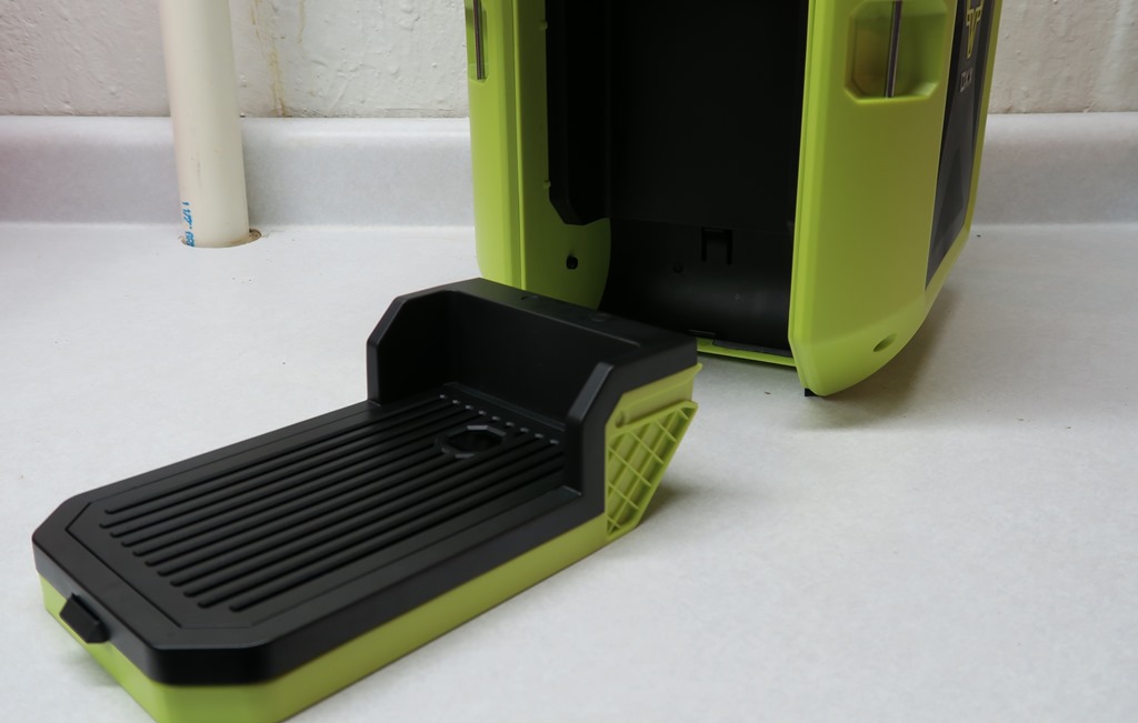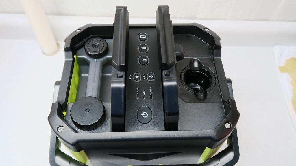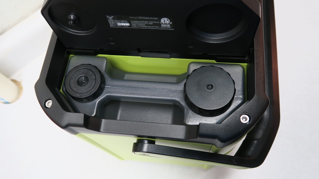 The OXX CoffeeBoxx claims to be the toughest coffee maker around and when you pick it up for the first time, you can see why.  The unit weighs 12 lbs empty and that is primarily because it’s built to take a beating that happens on job sites.  As you can see, the whole unit is made from a tough impact resistant polymer shell with a crush proof chassis up to 1,500 lbs.  Just by that alone, I would agree is this is the toughest coffee maker around.  The whole unit is water and dust resistant.  Don’t want the coffee maker moving around?  Well they have you covered.  The Oxx is designed with 6 stainless steel tie downs.  There is a large foldable handle so you can carry it your desired location, you can fold it down, so it’s not in your way.  One of the coolest features of this coffee maker is the 3′ retractable power cord.  Just pull the cord out and plug it in.