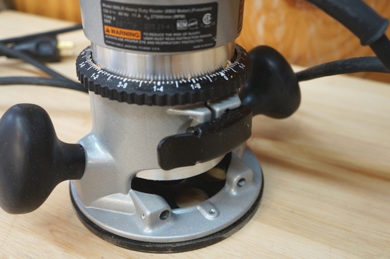 The one thing I did notice from this to my older version is the grip. Mine has more of a rounded handle, while this has more of an oval handle which feels much better. This router features an 11 amp motor with a peak of 1-3/4″ HP and has an rpm of 27,500. On the fixed base, inserting and locking the router is a snap. There is a cam lever to adjust and lock it into place. On the plunge base, this is much harder. The user has to use a small Allen wrench to tighten the router into the base. To get the router out, you have to take the screw all the way out. I find this method a little cumbersome and could have a better design, but I will touch on that in a bit.
