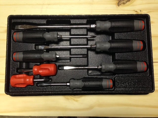 Looking at the drivers there are a few features that stick out. The black center portion of the drivers is textured to improve grip with oily hands. This isn’t unheard of for a hard handled driver, but it isn’t common either. Another thing that caught my eye was the abundance of distinctive markings that with a little studying, can be easily used to calculate quarter, half, 3/4, and full turns, a plus for the mechanics among us. Another key feature is the presence of hex bolsters on all but the stubby drivers. This allows for the use of a wrench to break loose stuck fasteners when necessary. The smallest hex bolster in the set is 1/4″, and they progress to 3/8″, 7/16″ and the largest ones are 1/2″. I also like the fact that the model number of each driver is laser etched into each shank meaning it won’t wear off in a week thus making identification for warranty or re-ordering purposes easy. As with all Proto tools, they’re designed to be tough and Proto claims them to be resistance to many types of oils, chemicals, and solvents. Our 8 piece test set (Model # J1208SCP) came in a nice plastic tray. I wouldn’t call it a heavy duty tray, but it isn’t flimsy either and should be sufficient for it’s purpose. It also fits into a shallow drawer on a standard top chest which is nice.