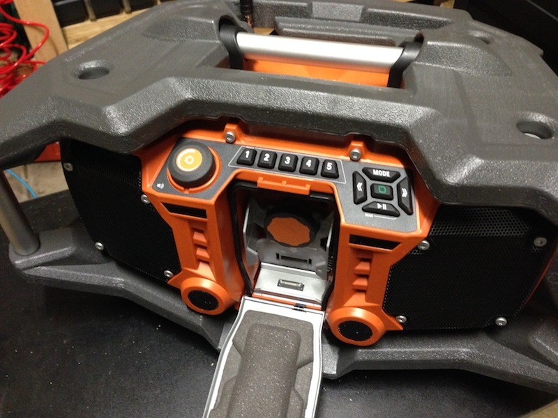 Two things that stand out with this radio are iPod integration and that it is tough! First let’s talk about the rugged enclosed design. There is basically a bumper protecting the entire radio from drops and damage. There are videos of this radio being dropped from water towers and run over with trucks. We actually drove over this radio with my F150 and it survived. There is no question that this will survive on a job site. The center LCD screen pops forward to reveal an adjustable padded compartment to hold your iPhone or smart phone. This is a very elaborate setup and there is plenty of padding and rubber seals to keep your device safe from pretty much anything including moisture.