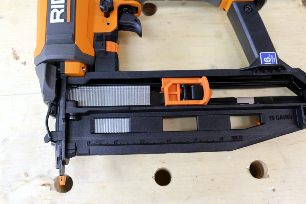 Each Ridgid finish nailer has a rear loading magazine with a by-pass pusher. This allows the operator to easily view the number of fasteners in the nailer and quickly load new fasteners.