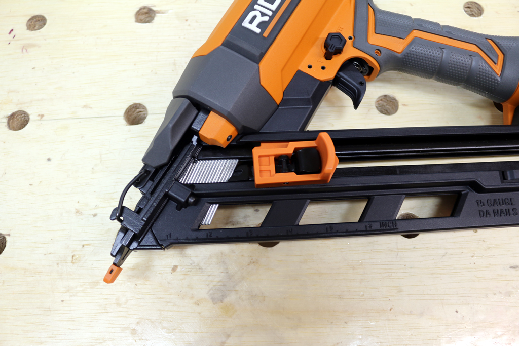 Each Ridgid finish nailer has a rear loading magazine with a by-pass pusher. This allows the operator to easily view the number of fasteners in the nailer and quickly load new fasteners.