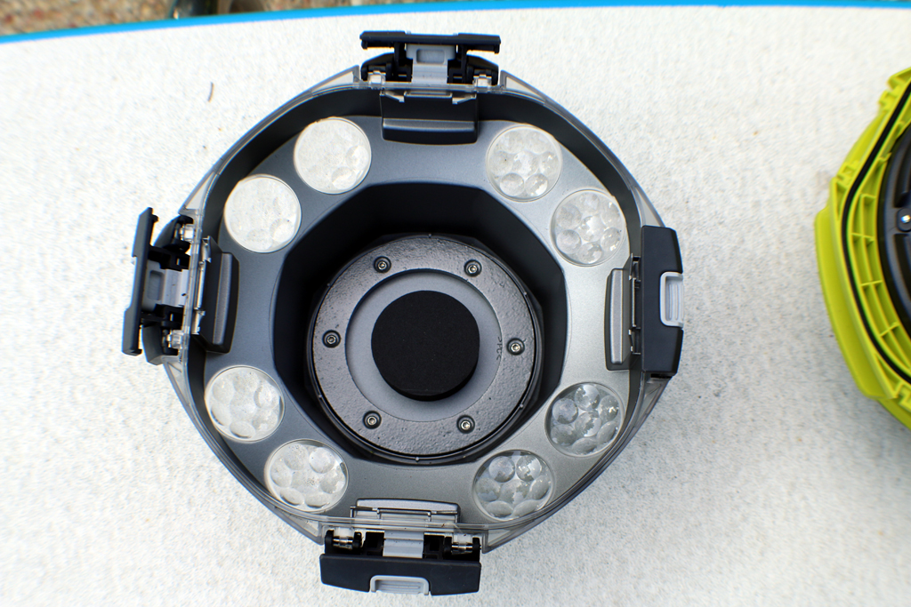 There are small LED lights around the inside rim of the top half of the unit. They line up with round lenses mounted on the bottom half of the unit. This allows the light to be spread over the bottom of a pool or hot tub