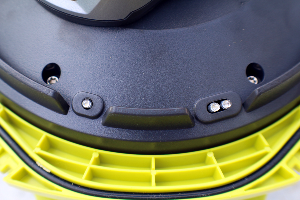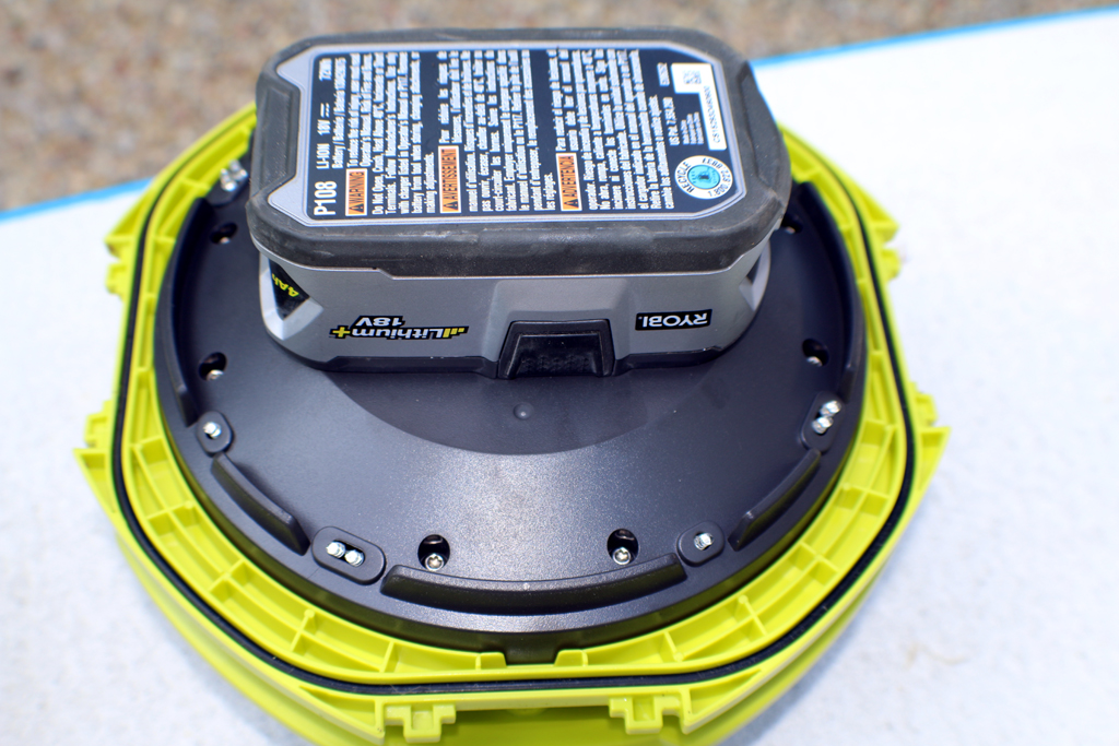 The Bluetooth floating speaker with light show has two halves that snap together with 4 latches and is sealed with a nice rubber gasket. The latches snap together very tightly and prevent water from getting to the battery. As you can see from the photos, any Ryobi 18-volt battery will plug into the top unit.