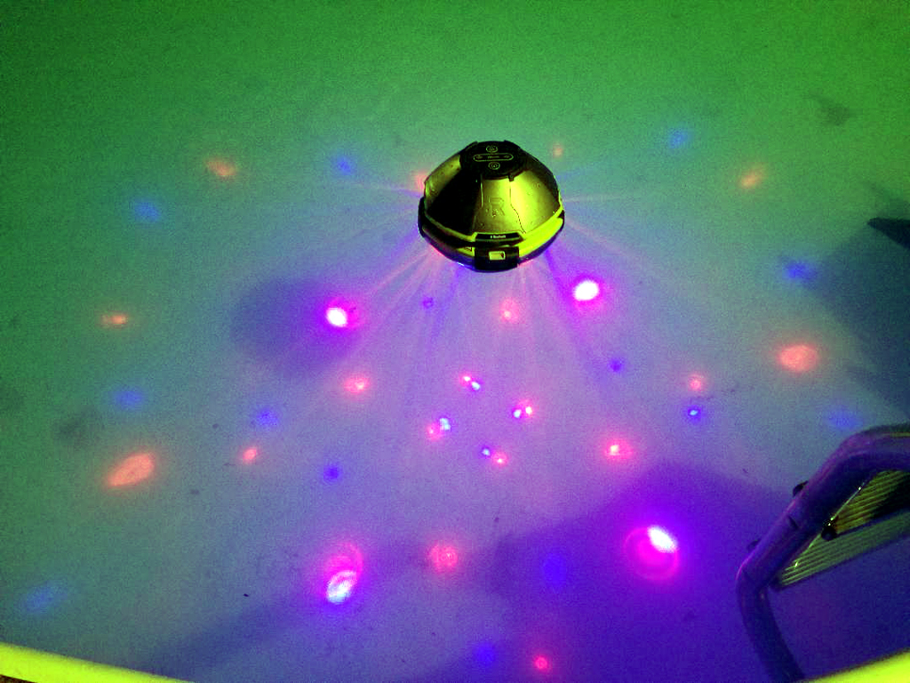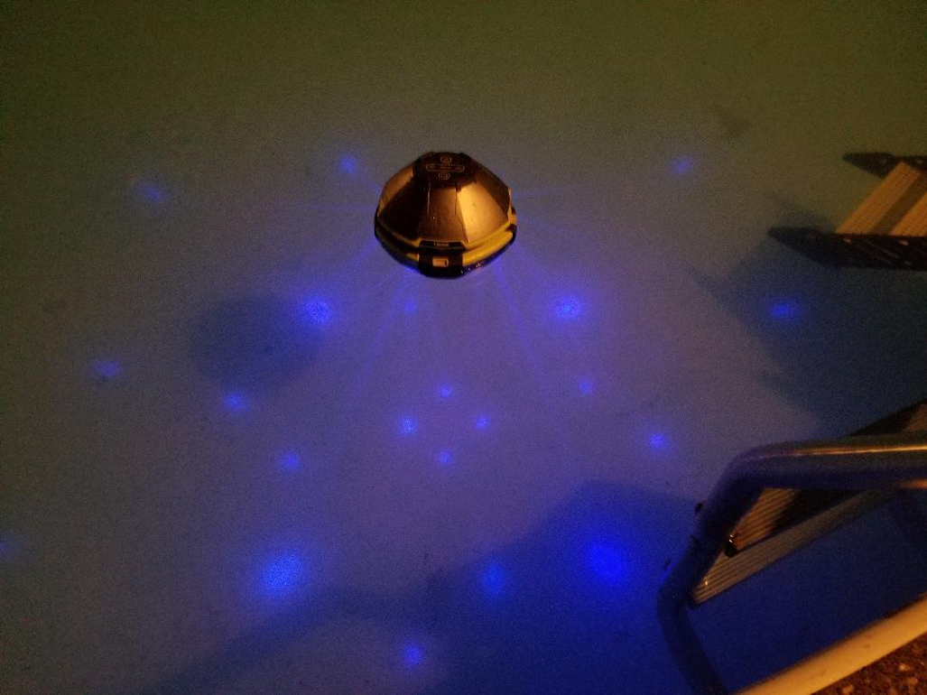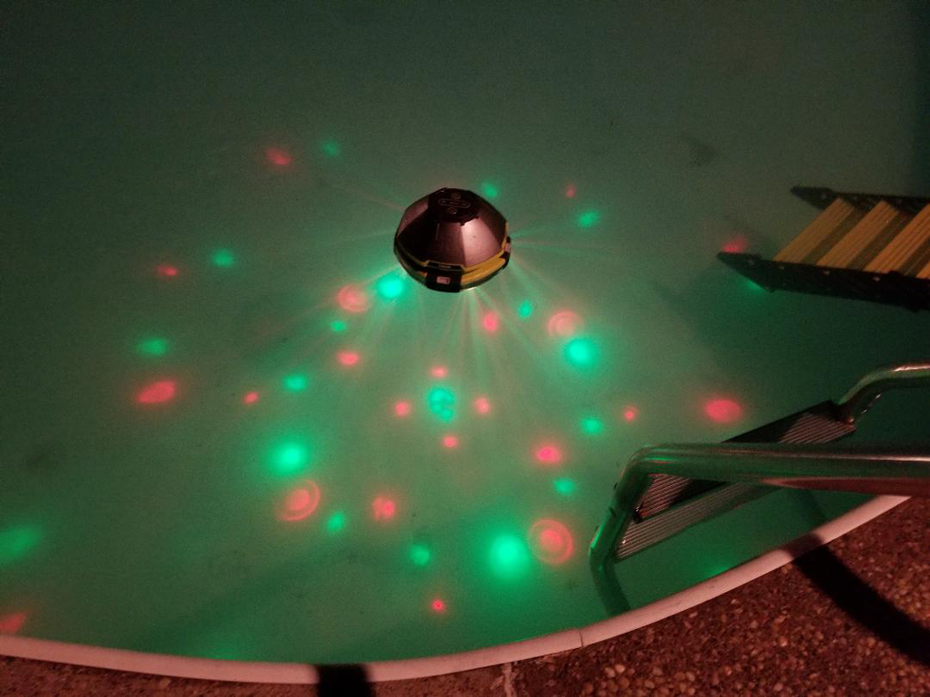 The Ryobi Bluetooth floating speaker with light show does an excellent job of lighting up a pool or hot tub when it is dark out. You will not be able to see any lights during the daytime hours though.