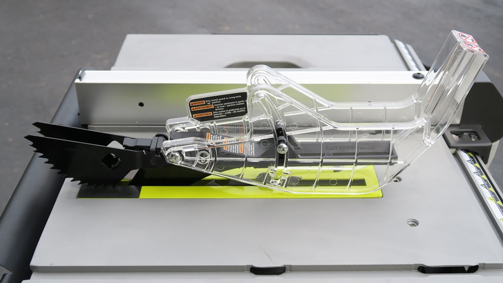 5. The riving knife has two hooks to capture saw guard and anti-kickback. There’s a small lever at the rear of the guard that locks it onto the riving knife. Just looked at the Ryobi 10″ table saw with rolling stand for $229.00 at Home Depot today. Really impressed with the fence and being able to roll it where-ever and store it out of the way when not needed. I’m not getting any younger and carrying it far would tax me even as light as it is.