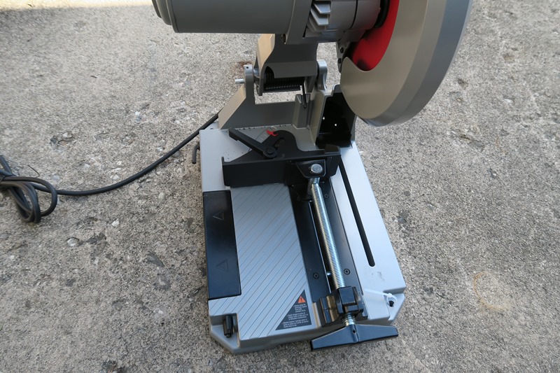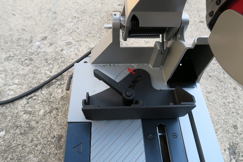 There is not a ton to talk about with these saws.  Basically they have an abrasive blade that cuts metal, so how does it perform?  Overall I like this saw.  The saw has a large D-handle that sits to the left of the blade.  For me it does take a little getting use to as I am so use to having the handle on the other side with miter saws.  However it’s not a huge deal to be on the left side of the saw.  When we were cutting with the saw, it seems powerful and really didn’t get it to bog down.  Obviously if you jam down it will bog down, but I am not sure who works like that.  Changing the blade is easy enough.  There is an on board hex key.  If you can change a circular saw blade, you shouldn’t have a problem with this saw.  In regards to the clamping system, I do like the design as it’s simplistic.  What I like is how easy it is to adjust to different sizes of materials.  Instead of having to turn the screw 500 times to open the jaws wide, you can just flip up a lever and you have the freedom to move the jaw to any position you desire.  Once you get it to the correct position, just flip the lever back and now you can turn the screw to tighten your material.