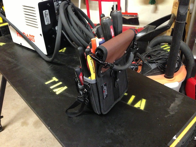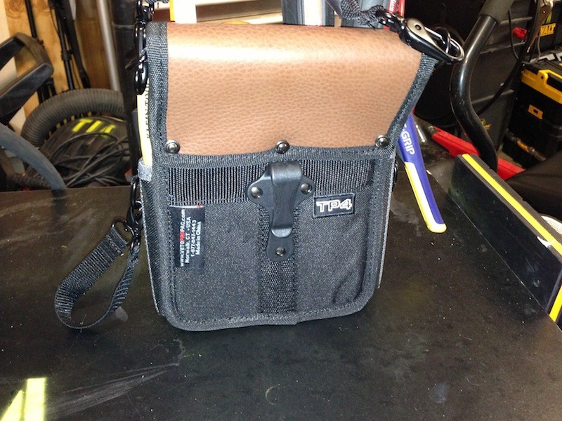 The Tp4 has a composite hook that allows you quickly hook and unhook it to a belt or a full sized Veto Pro Pac.  It also has a belt loop so you can slide your belt through to secure it to your person.  The bag has 20 pockets including 2 long shank pockets on the side.  There are 2 D rings and a 8″ strap to hold a variety of electrical tapes.  Just like all other Veto Pro Pacs there is always room for an extra tool.  The quality is great and the leather trim panels really make this a rugged bag.